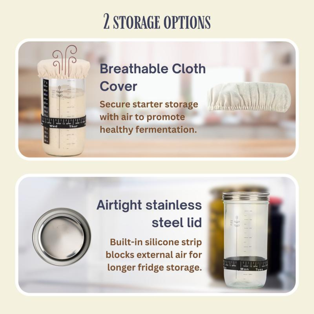 Includes a breathable cloth cover for active fermentation and an airtight stainless steel lid for secure storage, giving you full control at every stage of sourdough care.