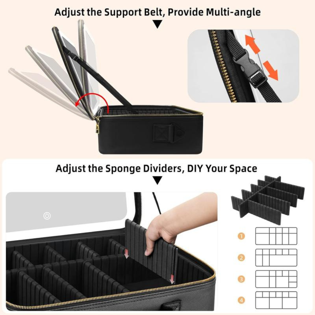 This Travel Makeup Bag with LED Mirror gives you everything you need to create flawless looks without limits. Designed with adjustable interior dividers, a built-in LED lighted mirror, and a sleek, travel-ready case, it delivers instant organization and perfect lighting the moment you open it.
